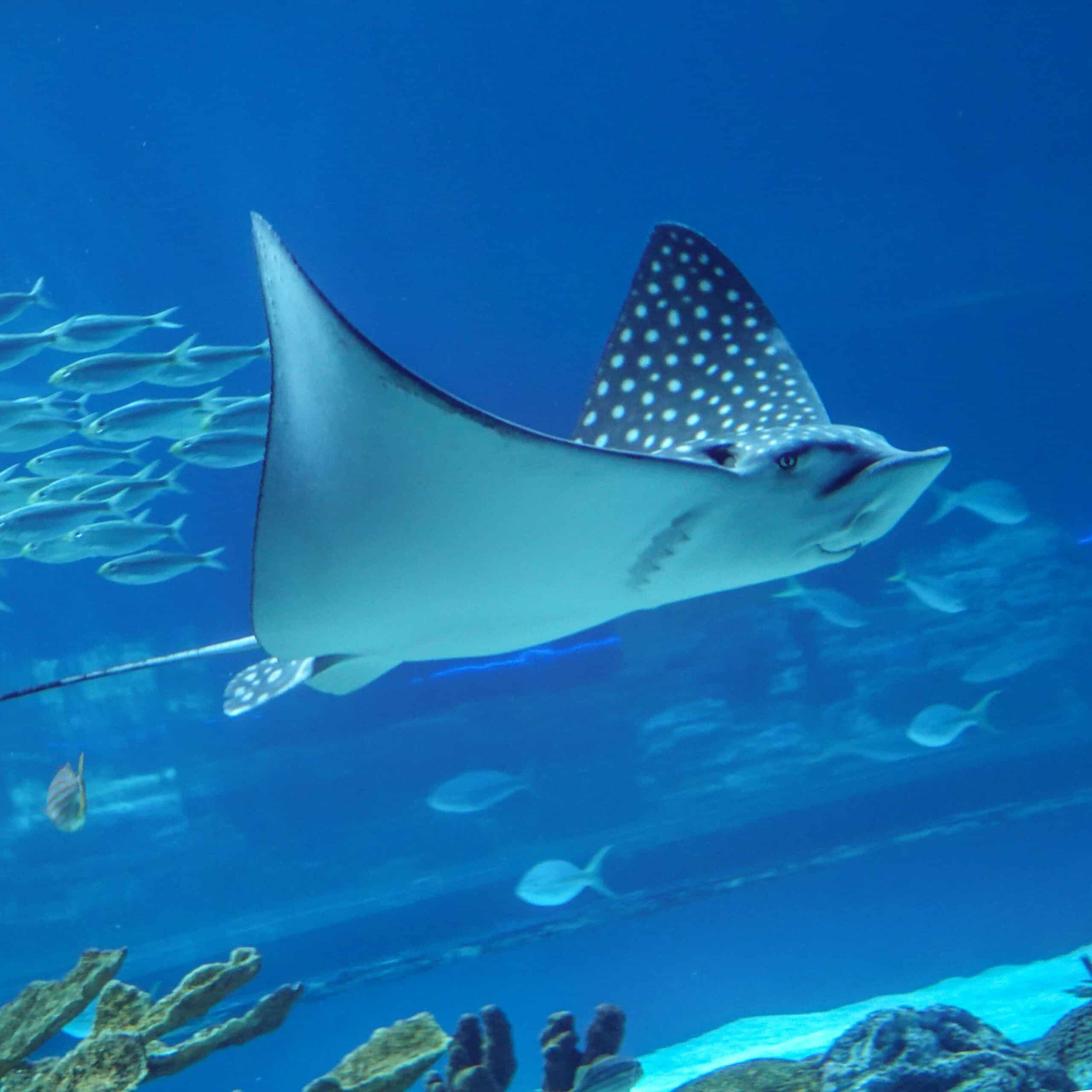 Our staff recently introduced a spotted eagle ray named Raymond to the Caribbean Sea exhibit. Want a few fun facts? The spotted eagle stingray is easily recognized by its long, upward-facing snout, and their rather friendly-looking faces. Their plate-like mouths allow them to crush their food, including mollusks, crustaceans and worms. And just like our fingerprints, no two spotted eagle stingrays have the same spotting pattern on their backs.