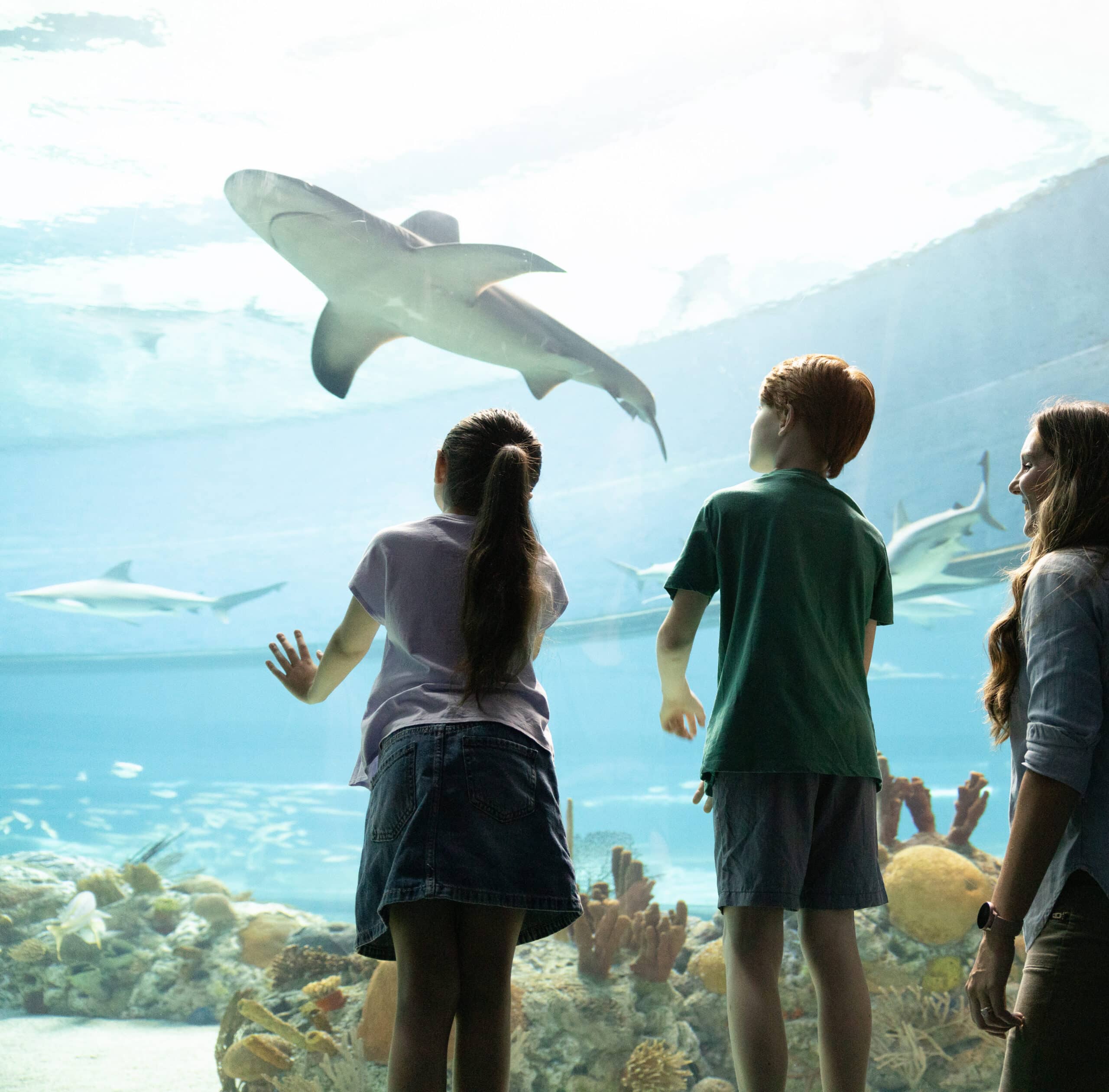 Three children and a woman watch sharks swim in a large aquarium tank, with coral and rocks at the bottom. One child has their hand raised toward the glass as the group observes the marine life.