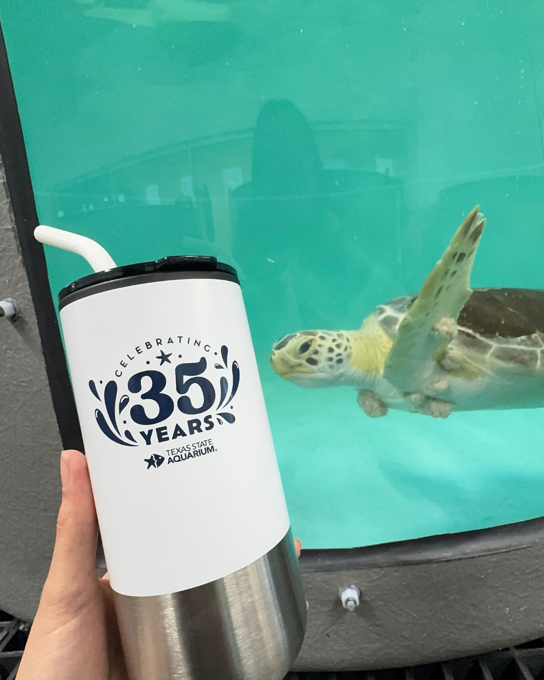 35th Anniversary Texas State Aquarium cup next to a sea turtle