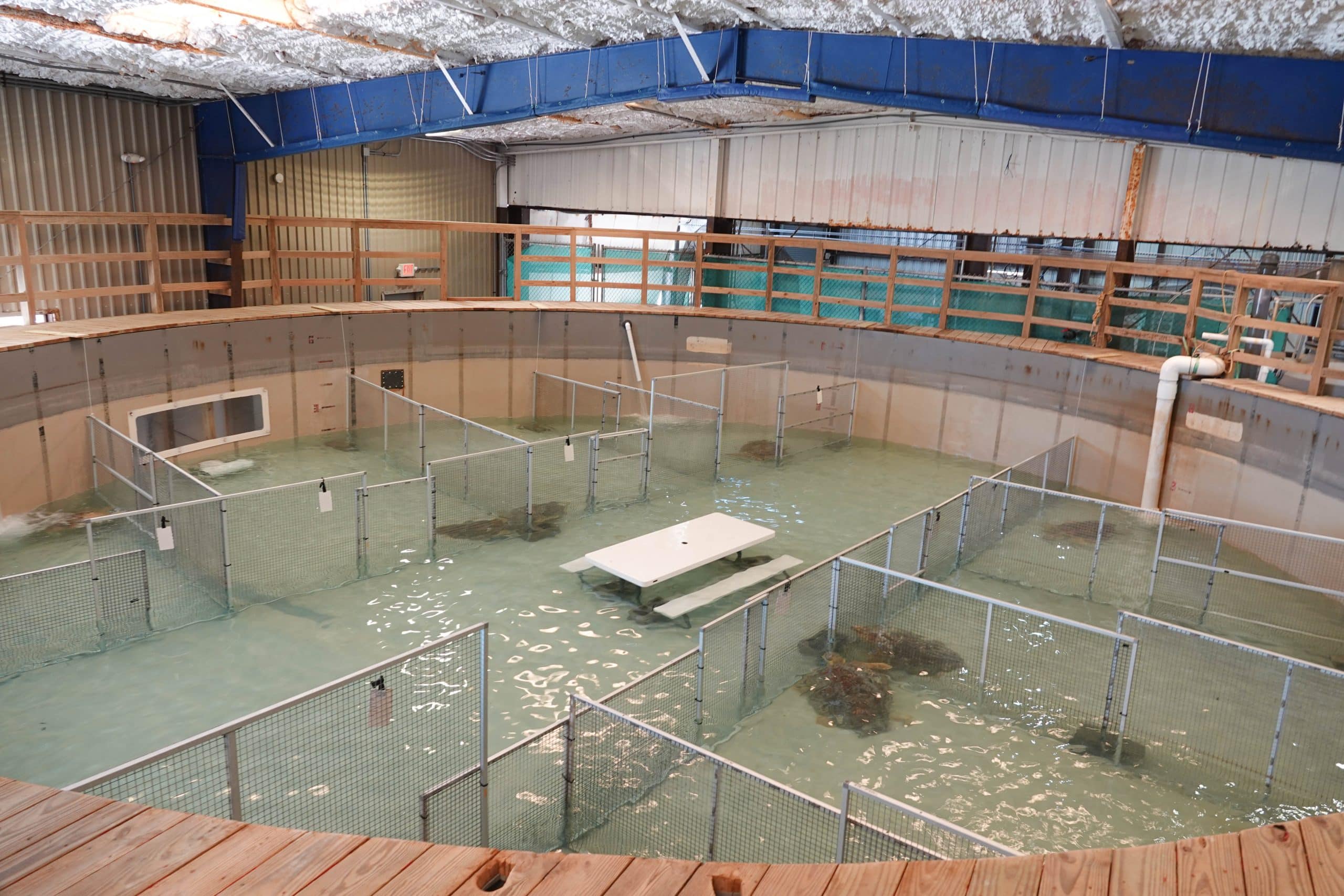 A large indoor tank divided into sections with metal fencing holds several sea turtles swimming in shallow water under a high, insulated ceiling within a facility.