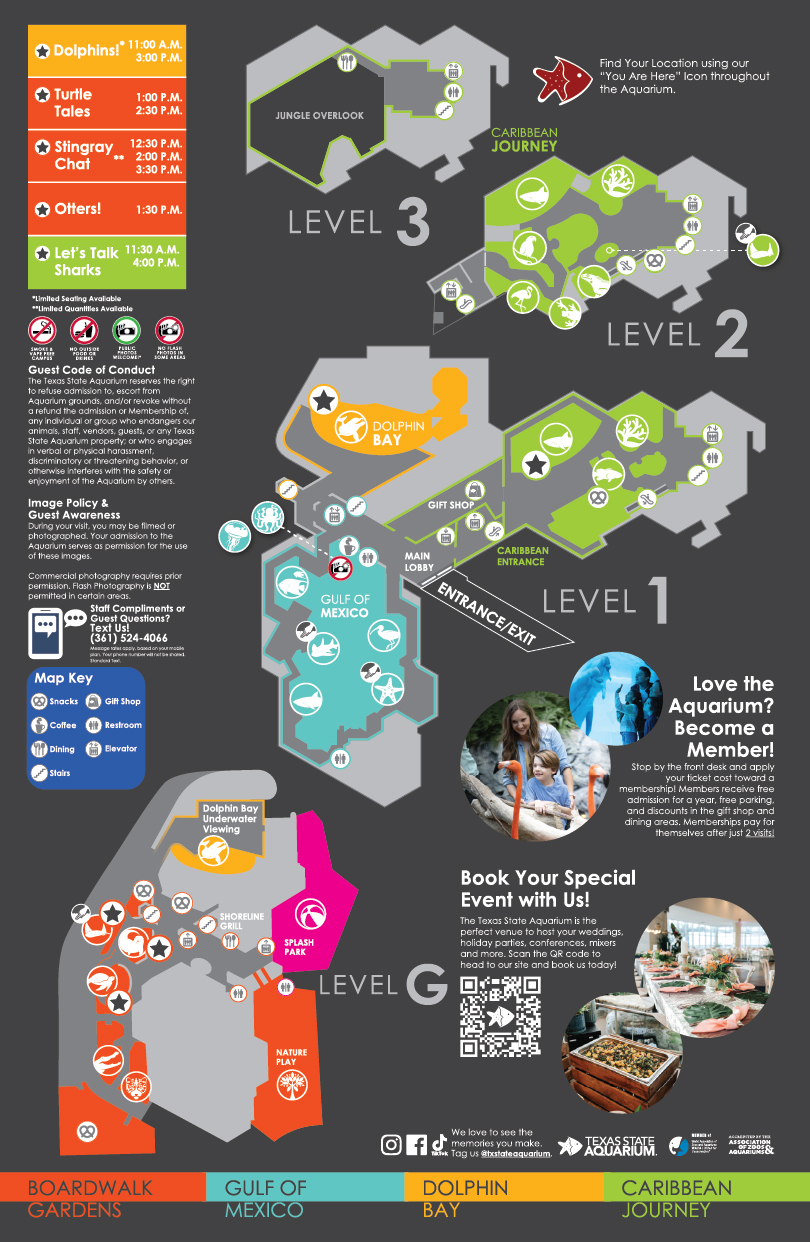 Explore every level of the Texas State Aquarium with our easy-to-use map. Find showtimes, exhibits, dining, restrooms, and more—right at your fingertips. Download now and dive into your day with confidence!