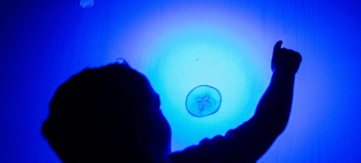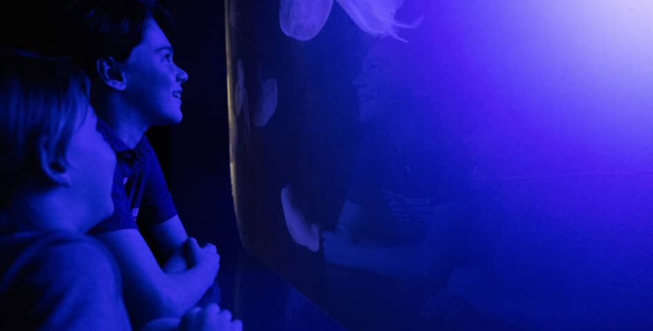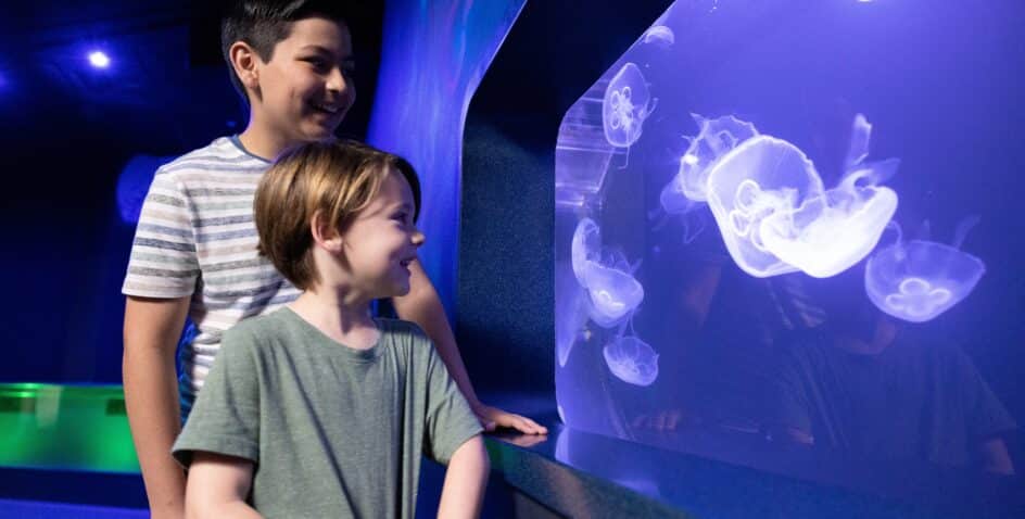 This dark environment showcases the ocean’s deepest depths, where sunlight can’t reach, but life thrives nonetheless. In this unfamiliar world, guests are treated to an up-close look at these unusual animals and even the opportunity to touch them. Several species of jellyfish are illuminated to give our guests an up-close at these floating phantoms – without fear of being stung. At our moon jelly touch pool, gently pet these delicate and translucent creatures and learn more about their fascinating features from our knowledgeable staff.